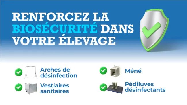 - Installations et équipements : arches de désinfection, vestiaires sanitaires, pédiluves, conteneurs pour cadavres et déchets vétérinaires