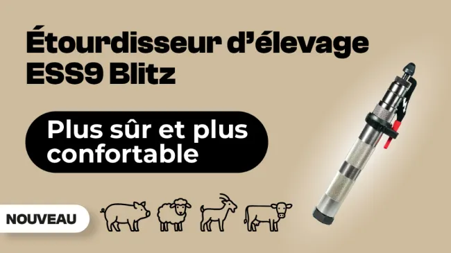 Étourdisseur d’élevage ESS9 Blitz pour porcs, ovins, caprins et veaux TurbocutL’étourdisseur d’élevage ESS9 de Turbocut est le nouveau standard des étourdisseurs d’élevage. Plus sûr et plus confortable. Convient aux porcs, ovins, caprins et veaux.