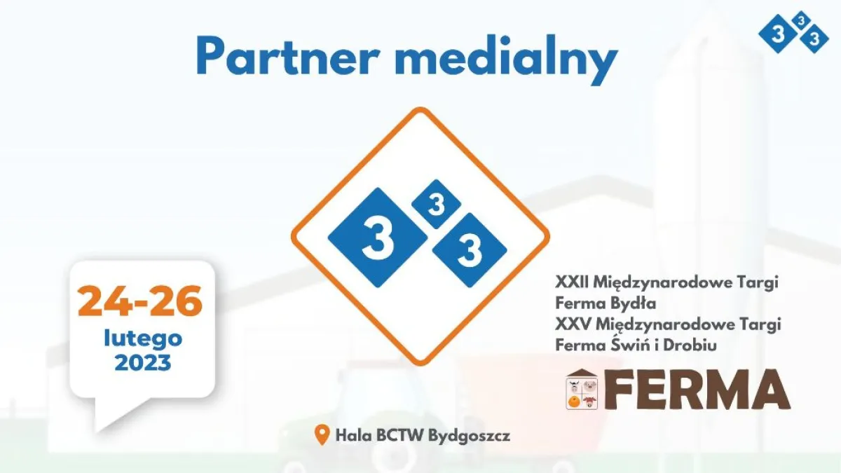 333 będzie obecny jako partner medialny na 25. edycji największych w Polsce specjalistycznych targów dla hodowców i producentów bydła, trzody chlewnej i drobiu - FERMA, które odbędą się w dniach 24-26 lutego 2023 r. w hali BCTW w Bydgoszczy