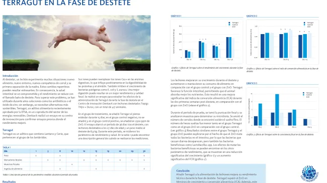Como mejorar el rendimiento en la fase de #destete de los #lechones con Terragut.Mejora el rendimiento en la fase de destete con TerragutAñadir Terragut a la alimentación de lechones mejora su rendimiento técnico durante la fase de destete. Terragut superó al ZnO en términos de crecimiento y conversión alimenticia (