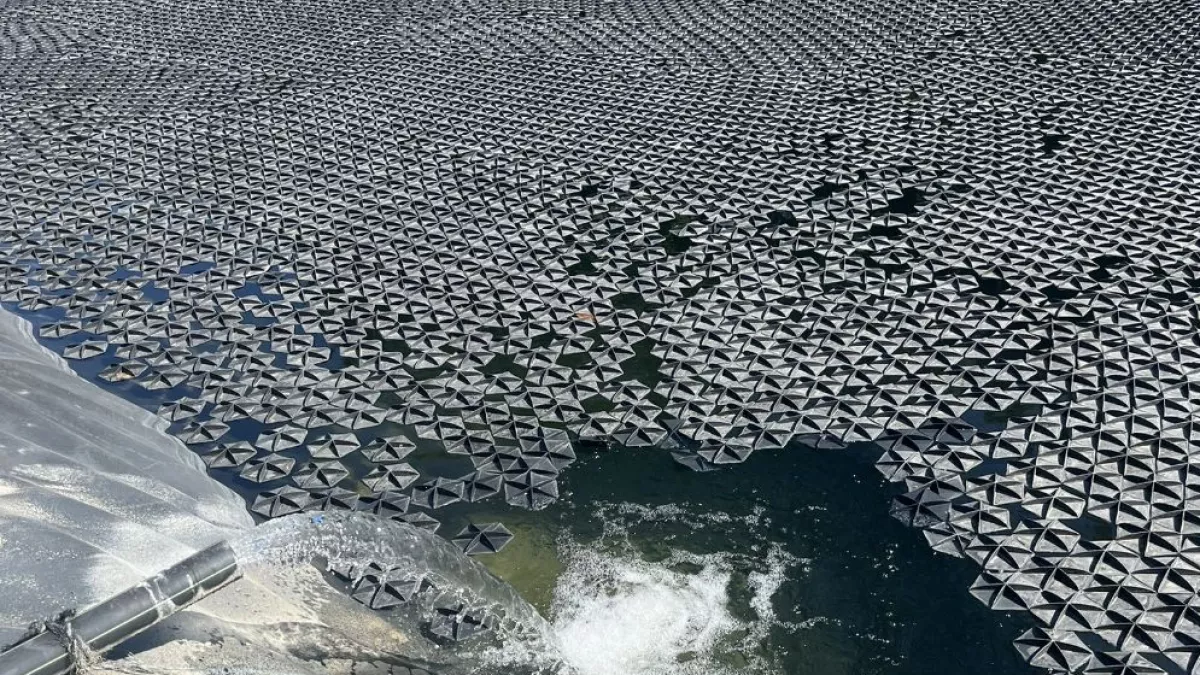 sobre la superficie de la balsa reduce la evaporación del agua de manera extraordinaria, siendo una solución fácil, eficaz  y muy recomendable para el ahorro de agua. en estos momento de severa sequía sobre todo el Estado.