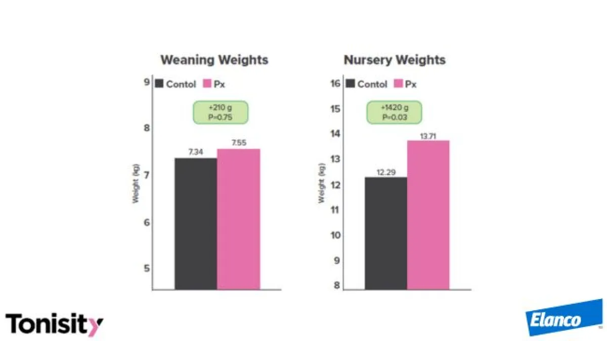 Este y el protocolo previo al destete de tres días con Tonistity Px mezclado en el pienso dieron como resultado que los animales del grupo Px consumieran 210g de alimento extra por el lechón antes del destete. Estos mismos animales, a las tres semanas posdetete, mostraron un peso extra de 1,42kg.