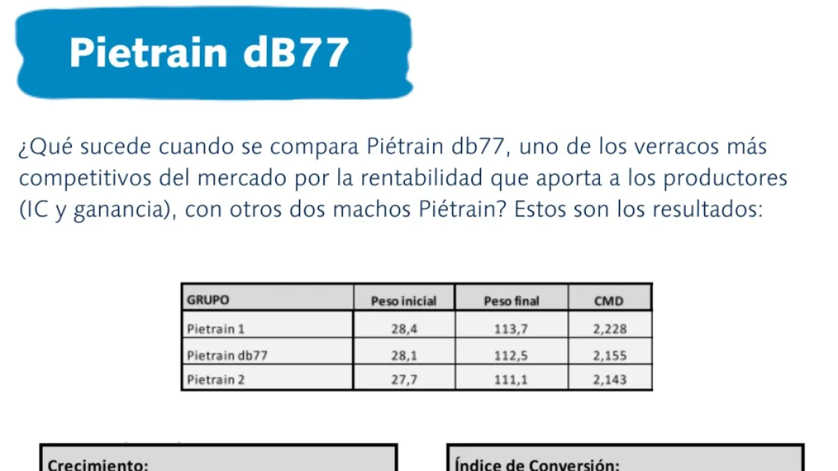 Desde los 28 hasta los 126 kg, se obtuvo un índice de conversión de 2,27 para dB77 mientras que para las otras dos líneas fue de 2,31 y 2,35 respectivamente.