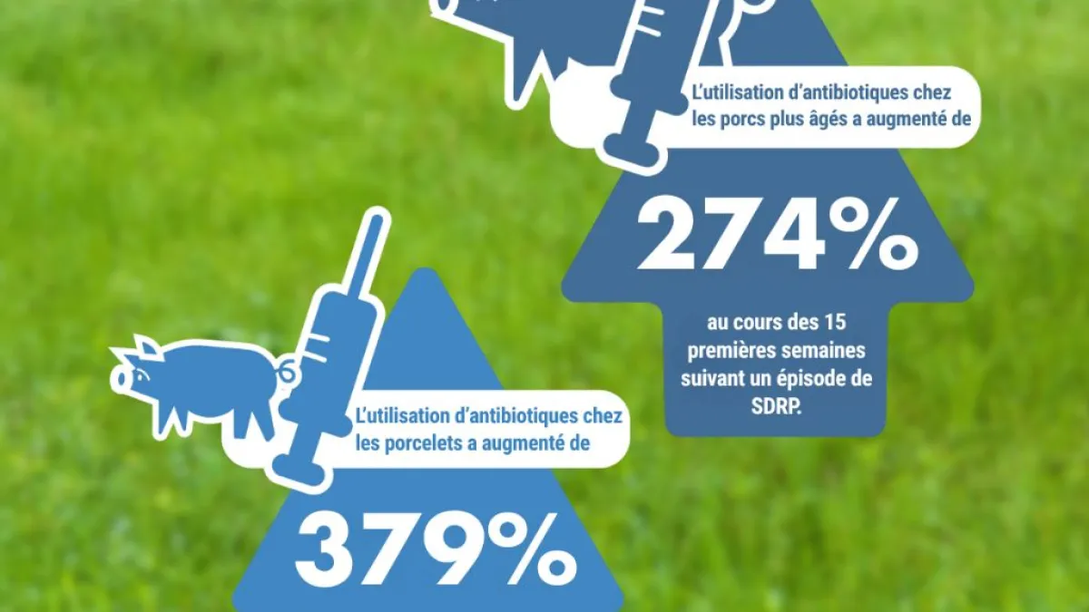 Selon des recherches de l’université d’État de l’Iowa, l’utilisation d’antibiotiques chez les porcelets a augmenté de 379 % après une épidémie de SDRP. Chez les porcs plus âgés, l’augmentation est de 274 %.