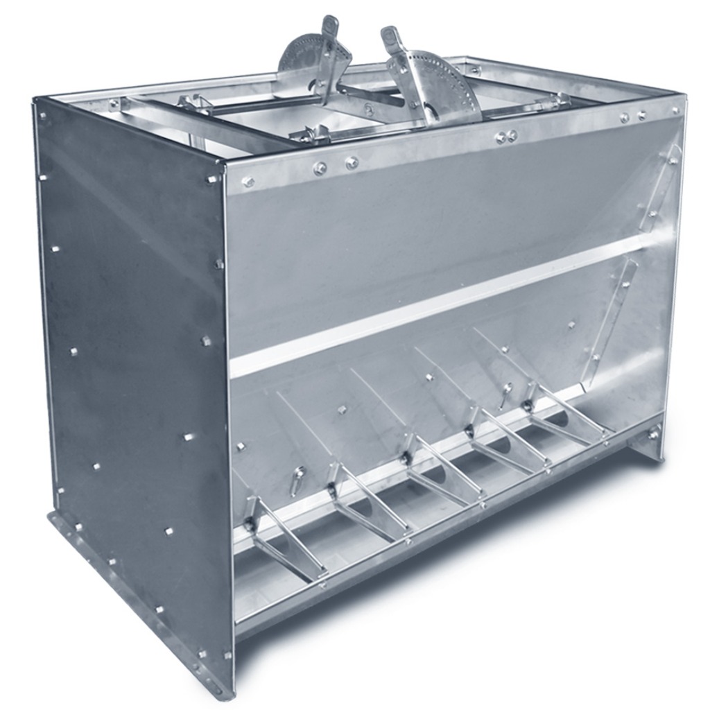 Las Tolvas Lineales Dobles para alimentación en seco en el destete están fabricadas completamente en chapa de acero inoxidable AISI 304. Estas tolvas están disponibles en distintas medidas lineales, que van de 6 a 24 bocas de alimentación. Este modelo de acceso doble (por dos caras: frontal i posterior) está diseñado para alimentar a dos corrales a la vez. La cantidad de pienso a subministrar se regula de forma fácil mediante la maneta de regulación de caudal que ofrece 25 posiciones posibles, de forma independiente en cada lado. Se puede subministrar el pienso a través de cualquier tipo de sistema de alimentación seca, tanto automático como manual.