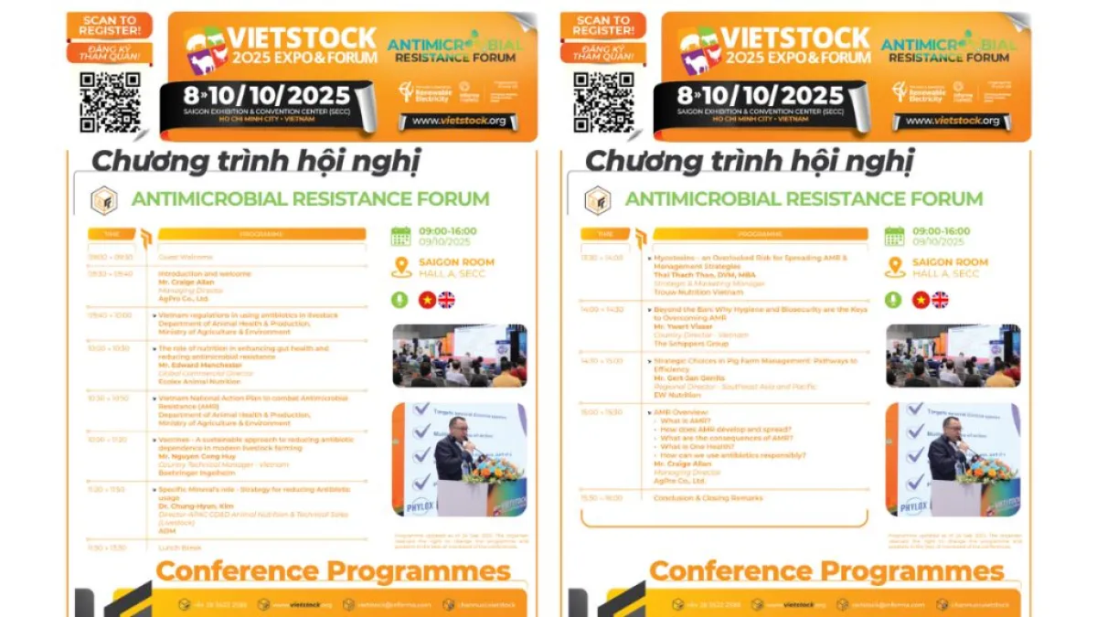 Antimicrobial resistance (AMR) is becoming one of the biggest challenges for Vietnam’s livestock industry, driven by the misuse and overuse of antibiotics. To raise awareness and deliver practical solutions, Vietstock 2025 will host the Antimicrobial Resistance Forum for the first time, bringing together leading experts to share insights, discuss key issues, and explore actions for the future of the industry.