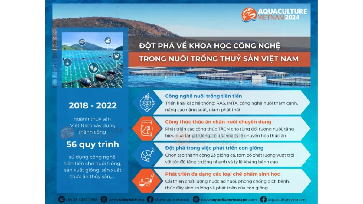 Để thúc đẩy sự phát triển của ngành thuỷ sản, Việt Nam đã xây dựng thành công 56 quy trình sử dụng công nghệ tiên tiến cho nuôi trồng, sản xuất giống, sản xuất thức ăn thủy sản,...