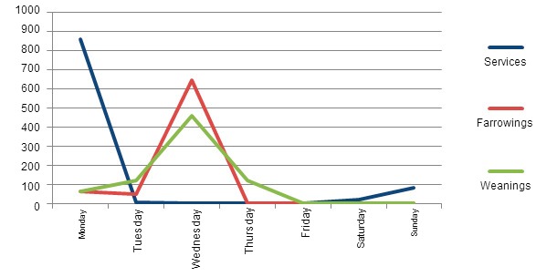 下图对此作出了很好的解释。该图表明一周每天的主要工作分布情况(配种,分娩和断奶)