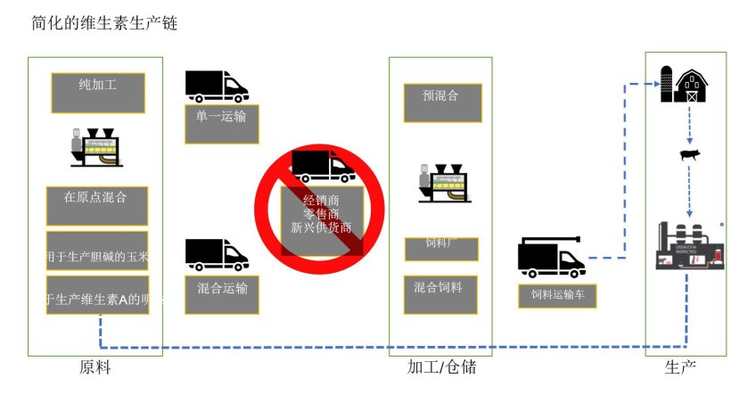 绝大部分维生素是在中国生产的,如果不使用中国产维生素,美国几乎不可能满足其养猪业所需的量。因此,明尼苏达大学的科学家与猪业生产者、饲料制造商和动物饲料维生素供应商进行了会谈。维生素是在具有严格食品安全标准,良好制造规范和第三方质量认证的生产工厂中生产。将纯维生素运输到目的地国家,未进行混合。不过,也有例外。维生素A等维生素需要与明胶和氯酸胆碱混合,需要使用玉米。供应商公认维生素在超过120天的运输中,有足够时间以灭活塞内卡病毒,并达到生猪生产商建议的最低成分检疫要求。然而,在有些国家,维生素供应商和经销商对进口产品的原产地追溯能力有限。