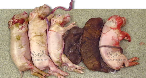 图表1.通过实验室人工授精法感染PCV2的母猪产下的一窝仔猪。此窝产仔数很少且出现两个木乃伊胎