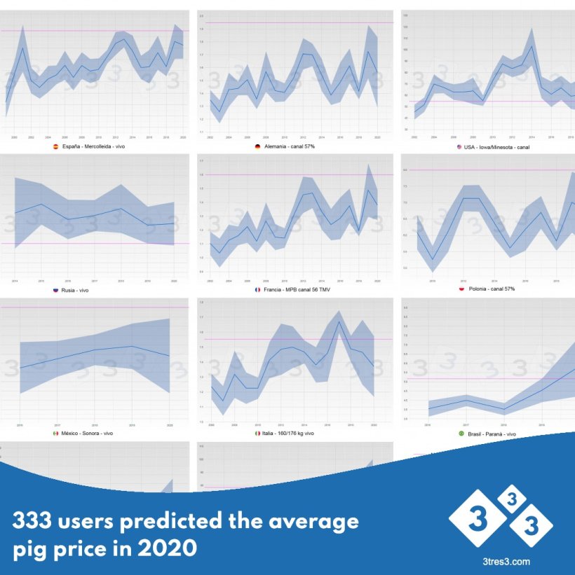 俄罗斯、巴西和哥伦比亚三个国家/地区2020年生猪平均价格高于333用户的预测。俄罗斯用户曾预测,平均价格将低于过去3年的水平,但从2019年起基本保持稳定。巴西的生猪平均价格在过去几年里迅速上涨。巴西用户曾预测比前一年会有所增长,但预测值略低。至于哥伦比亚,用户预测平均价格将从2019年开始下降,但实际价格却上涨,超出了他们的预期。