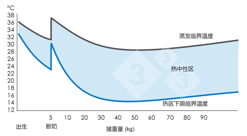 猪对高温和低温都有反应。但这种反应与他们感知的热感有关。这不是温度计读数的准确反映。热感觉是温度、湿度、地板类型、通风率、品种类型、日粮组成和摄入量等的函数。通过观察猪,我们可以知道它们是否处于 热舒适区 或 热中性区; 下限为下临界温度 (LCT) 上限为 蒸发临界温度(ECT). 当温度低于LCT时,猪会挤在一起,趴着睡觉以保持温度,并增加每日摄入以产生更多的热量,从而影响饲料转化。