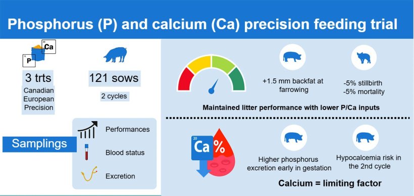 另一条战略方向是磷和钙等营养的精准饲喂,该研究通过对121头母猪跨越两个繁殖周期的血清学及尿液排泄评估进行。试验证实,在降低磷和钙摄入量的情况下仍可维持产仔性能,同时增加分娩时的背膘厚度(+1.5毫米),并使死胎率和死亡率均降低5%。然而,结果也显示钙可能成为限制因素,尤其在第二个繁殖周期中,若向分娩阶段的过渡管理不当,存在低钙血症的风险。