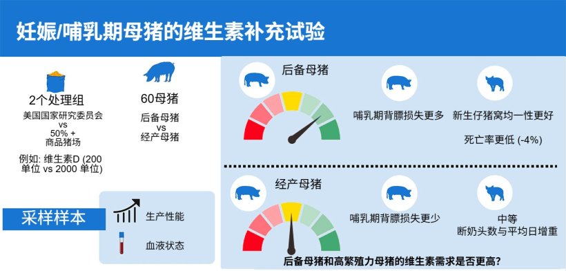 妊娠期和哺乳期的维生素补充一直是另一重要研究方向。在针对60头母猪的研究中,将NRC推荐水平与提高50%的水平(例如,将NRC推荐的200国际单位维生素D与2000国际单位进行比较)进行对比后发现,后备母猪的产仔均匀性更高,死亡率降低4%。结果表明,后备母猪和高产母猪的维生素需求可能被低估,尤其是在高代谢需求的情况下,尽管这对哺乳期机体储备动员有不同的影响。