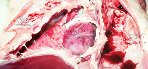 3头大仔猪都表现不同程度的多发性浆膜炎。所有都表现广泛地组织性胸膜炎和心包炎,其中一头表现腹膜炎。三头小仔猪相应病变程度较轻,只是在胸膜上存在纤维蛋白聚集。