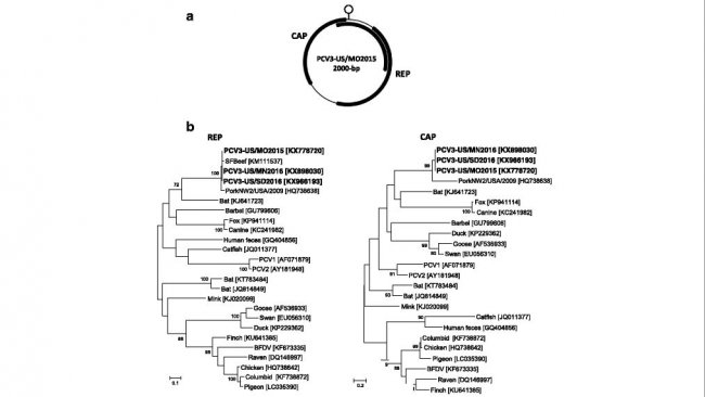 猪圆环病毒2型(PCV2)已经成为对生猪生产破坏性最大的病毒,造成相当大的经济影响(直接损失和控制疾病的花费)。PCV2是断奶仔猪多系统衰竭综合征(PMWS)的病原体,目前被称为PCV2-系统性疾病(PCV2-SD, 图 1)。流行病学和和实验研究已证明基因多样性可能影响PVC2的毒力,表现为在全球范围内出现新的基因型以及重组株的流行。也许这正是为什么PCV2种间分类颇具争议的原因。2008年,欧盟猪圆环病毒病联盟提出了以成对基因序列比较为基础的PCV2基因型标准命名法(www.pcvd.eu)。通过分析PCV2完整和衣壳(ORF2)核苷酸序列确定了2个距离阈值,分别为0.020 和0.035。当2个序列之间的遗传距离大于这两个阈值时,认为这些毒株属于不同的基因型。分析发现了4种基因型,分别命名为PCV2a, PCV2b, PCV2c和 PCV2d(也被称为PCV2b突变型)。