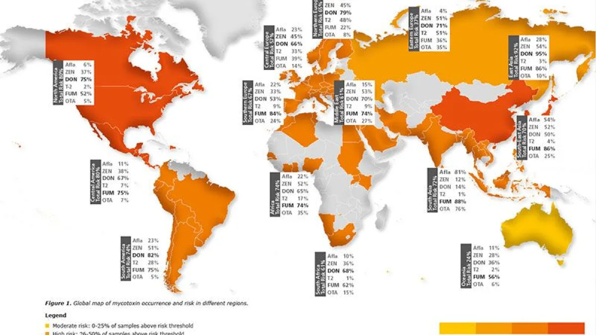 Mappa globale della ricorrenza e del rischio di micotossine in diverse regioni. I quadrati indicano quanti% dei campioni analizzati della regione sono stati contaminati con le rispettive micotossine. I colori indicano diversi livelli di rischio in base alla legenda riportata di seguito. https://www.biomin.net/en/blog-posts/2017-biomin-mycotoxin-survey-results/