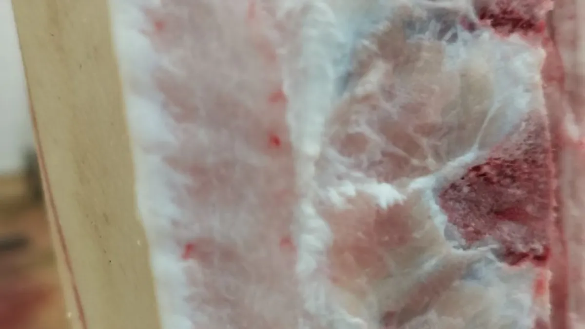 En stage dans un abattoir de la Réunion, j'ai été surpris de voir des carcasses de porc avec de la graisse rosâtre sur presque toutes les carcasses. La bardière surtout était atteinte (cf photos en gros plan, toute la longe avait le même aspect) . Celà ne pose pas de problème sachant en plus que la viande n'est commercialisée que sur l'ile. En revanche, je n'ai pas d'idée sur l'origine de cette coloration. je pense à l'alimentation mais quel aliment peut donner cette couleur.