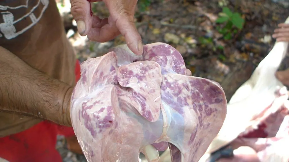 Is PSE (Pale, Soft, Exudative) meat coming from a 6-month old pig with affected lungs (in photo), and gastric ulcer safe to eat? Animal was constipated, had mild fever a day before slaughter, inappetant, refused to drink, lethargic. Meat has off-odor but no visible signs of disease.