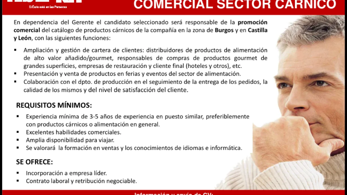 Somos una empresa de selección y buscamos comercial con experiencia en venta de productos carnicos