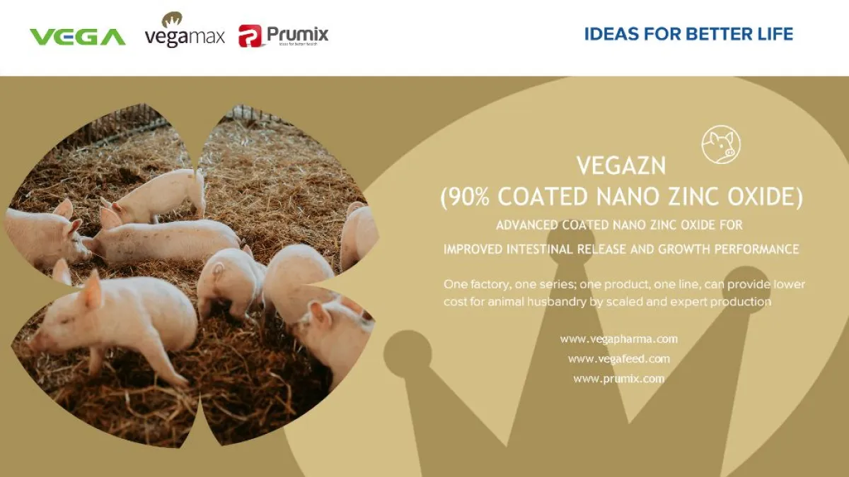 VegaZn: a 90% coated nano zinc oxide with advanced technology for targeted release in the intestine. Its high bioavailability and dispersion in the intestinal tract make it a powerful alternative to ordinary zinc oxide, promoting growth and reducing diarrhea in weaned piglets.